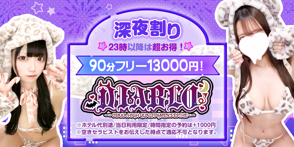 【深夜割り】 2025/12/02 23時以降は超お得! ◇ディアブロSPコース◇ 90分フリー13000円! ◇密着マイクロ洗体コース◇ 90分フリー17000円! ※ある程度タイプ合わせOK※ホテル代別途※当日利用に限る※時間指定の予約は+1000円※空きセラピストをお伝えした時点で適応不可となります。
